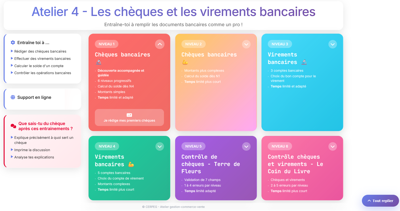 Cet atelier d'entraînement progressif permet d'acquérir les réflexes professionnels pour gérer des moyens de paiement avec rigueur et précision, le chèque et le virement. À travers des simulations réalistes, l'élève s'exerce dans différents contextes (supermarché, garage, cabinet de conseil, fleuriste, etc.) pour développer son aisance dans le suivi de la trésorerie et des moyens de paiement.