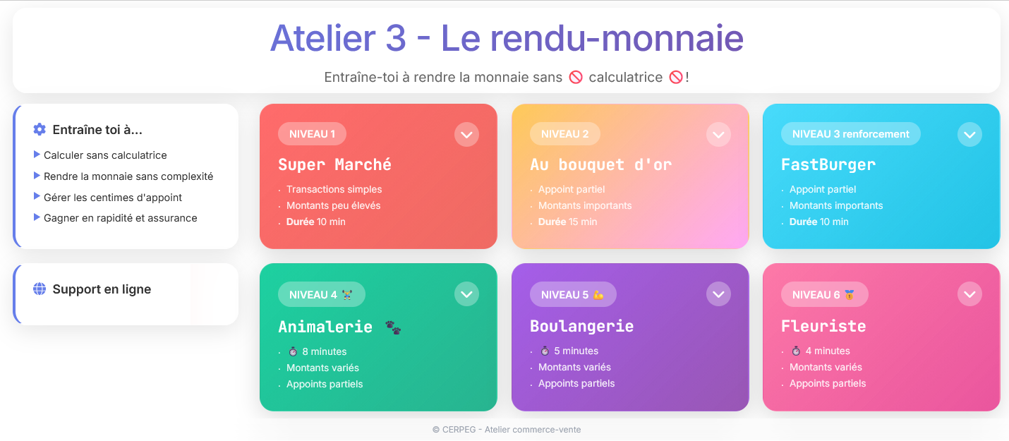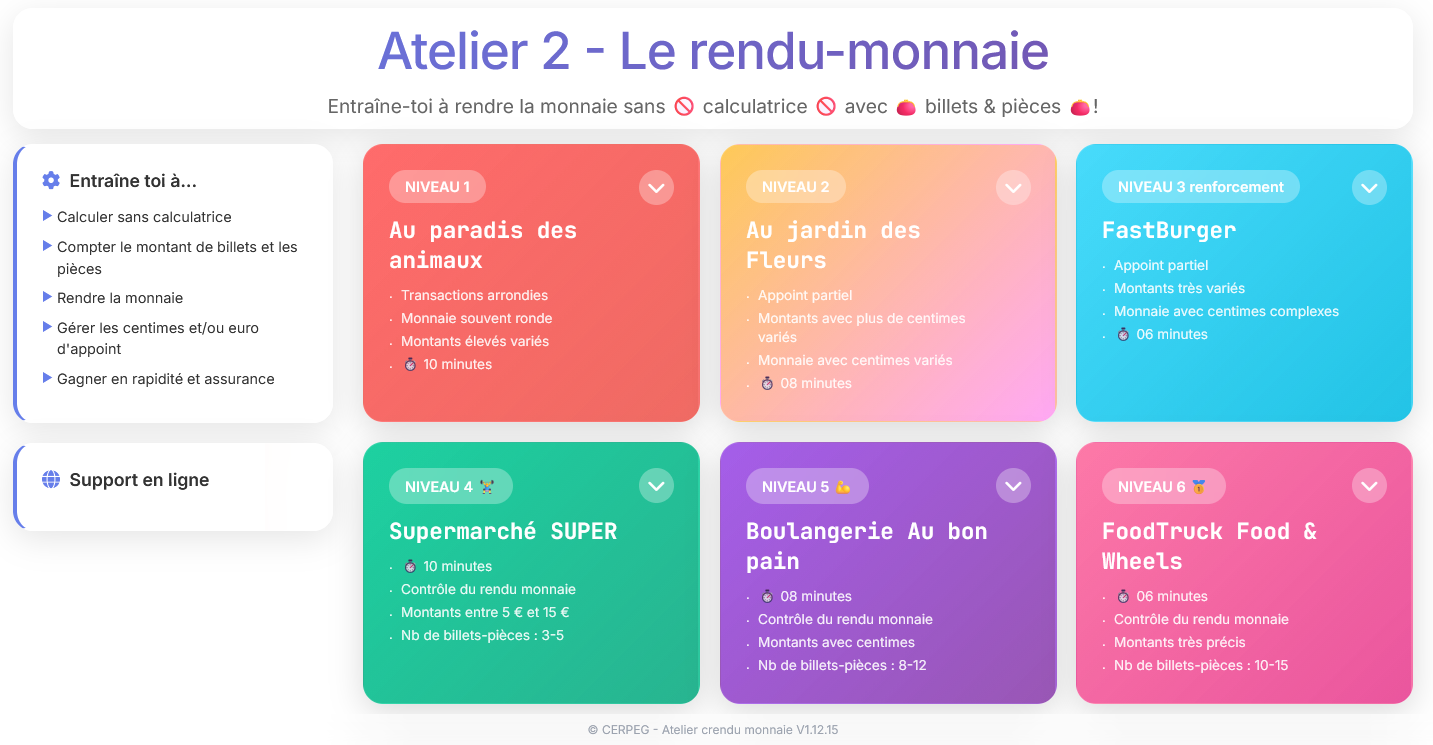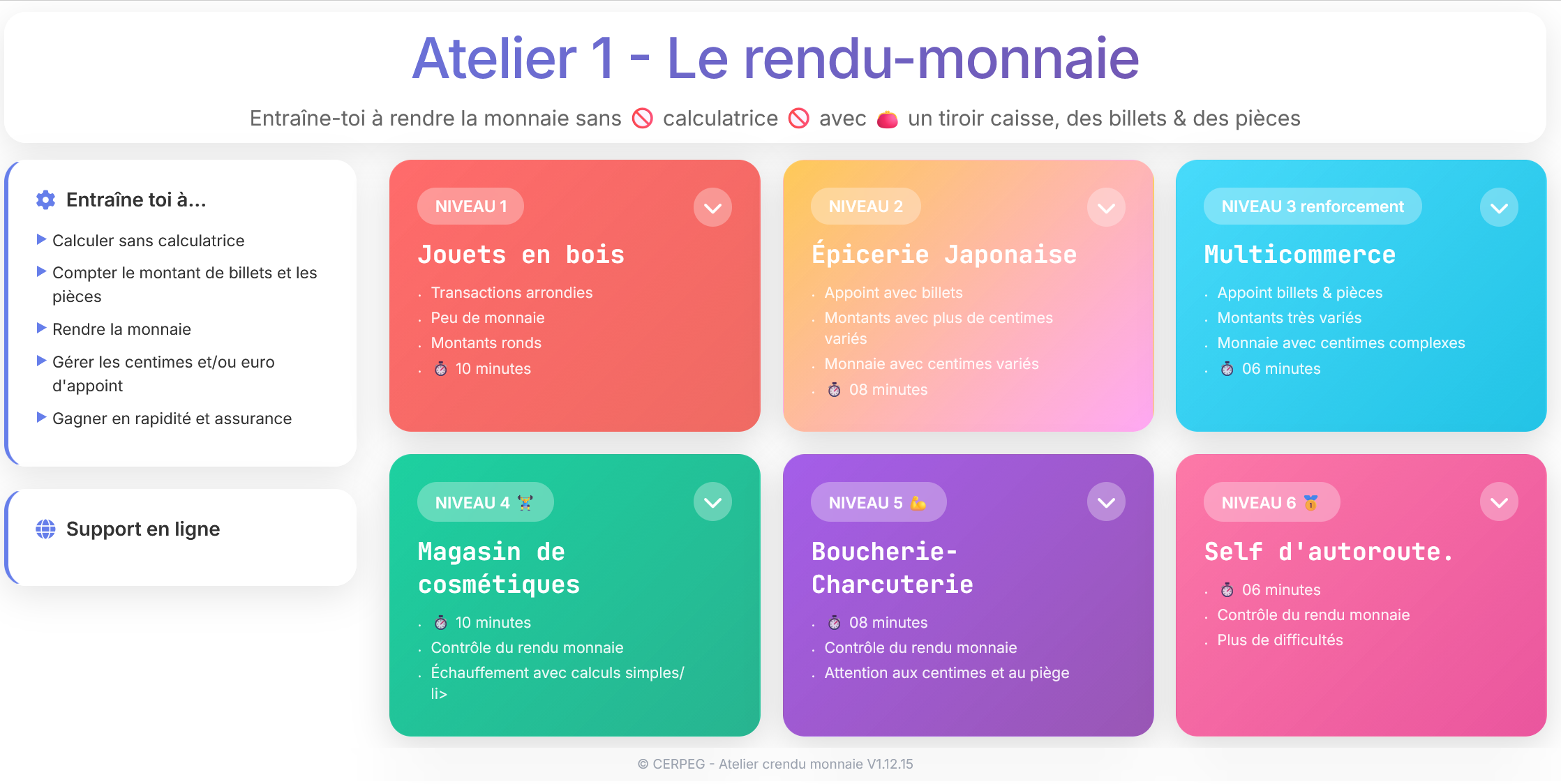 L'élève visualise l'argent donné par le client en billets & pièces. Il compose physiquement la monnaie en sélectionnant et en déposant les billets et pièces appropriés dans la zone de rendu monnaie. Cette approche simule la gestuelle réelle de la manipulation monétaire au poste de caisse.